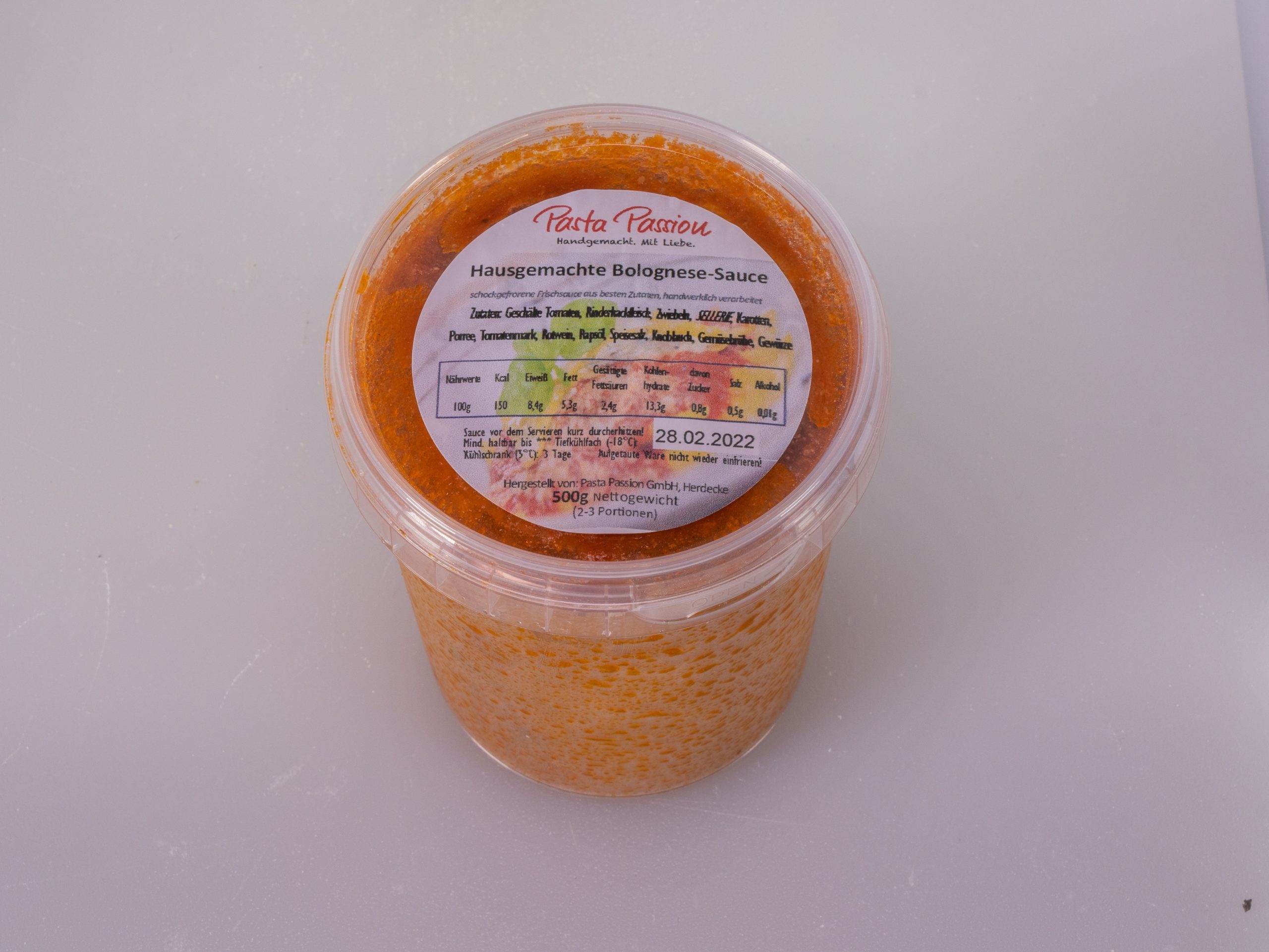 Der 500g-Becher reicht für 2 Personen, von Bolognese braucht man mehr pro Person als von den anderen Saucen – vielleicht, weil sie so lecker ist? Auftauen lassen und erhitzen, dabei stets umrühren. Aufgetaut hält die Sauce im Kühlschrank bis zu einer Woche.