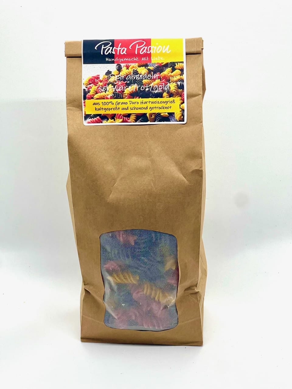 Hausgemachte vegane Spiralnudeln aus 100% Grano Duro Hartweizengries, dreifarbig, kaltgepresst und schonend getrocknet. Diese Spezialität haben wir zur Fußballeuropameisterschaft 2024 “erfunden”, aber weil die Nudeln so toll auf dem Teller aussehen, bleiben sie im Sortiment.