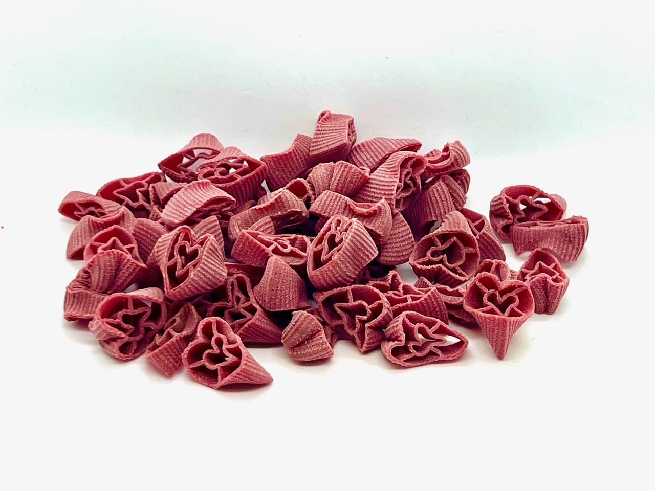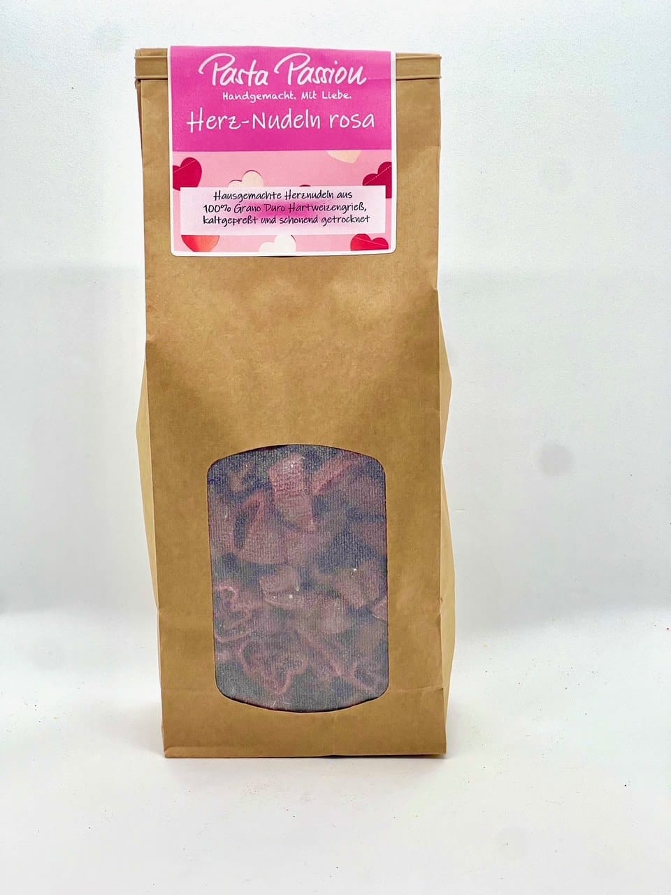 Vegane hausgemachte herzförmige Nudeln aus 100% Hartweizengries, mit Rote Bete Pulver gefärbt, kaltgepresst und schonend getrocknet. Mit schön rauer Oberfläche, so dass die Sauce gut aufgenommen wird.