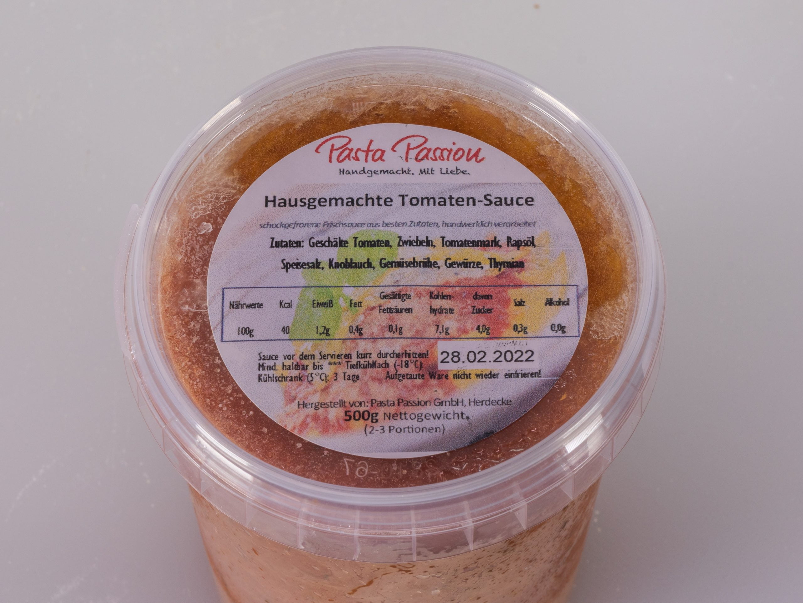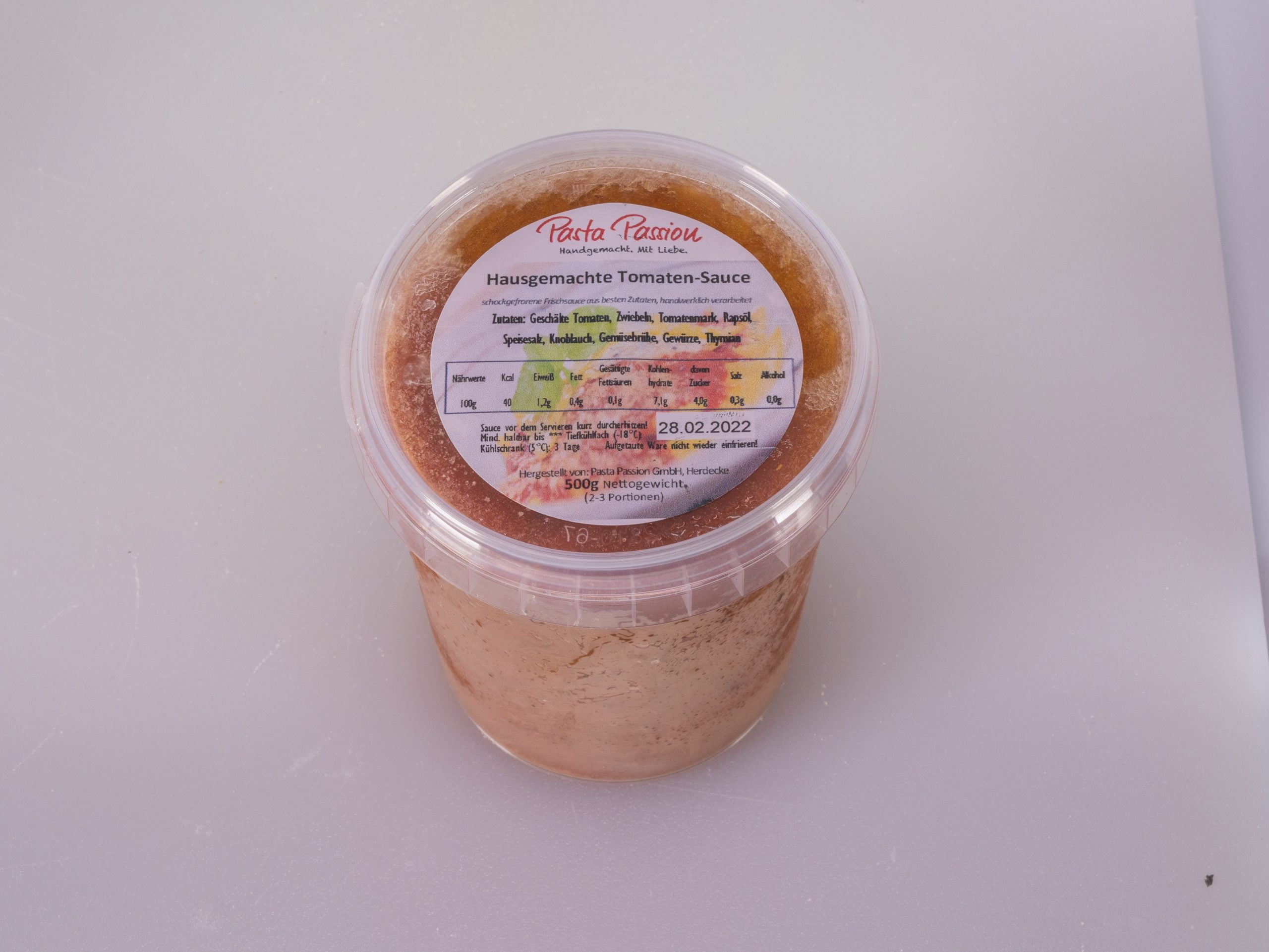 Hausgemachte leckere Tomaten-Sauce mit feinen Gewürzen. Diese Sauce ist ein Allround-Talent, sie wird mit Pepperoncini oder Sambal Oelek zur Arrabbiata-Sauce, mit ausgelassenem Bacon und Sambal Oelek zur Amatriciana-Sauce, mit schwarzen Oliven, Kapern und Sardellen (und – klar – Sambal Oelek) zur Alla Puttaneca, mit geschmorten Champignonsscheiben zur Pilz-Sauce usw.